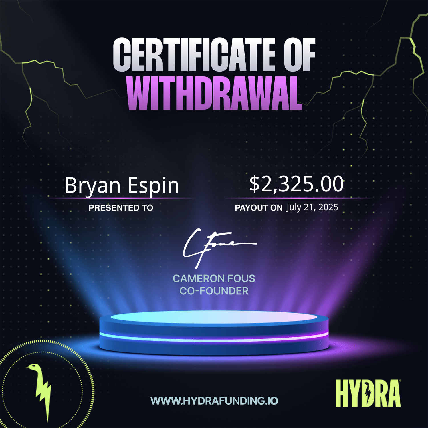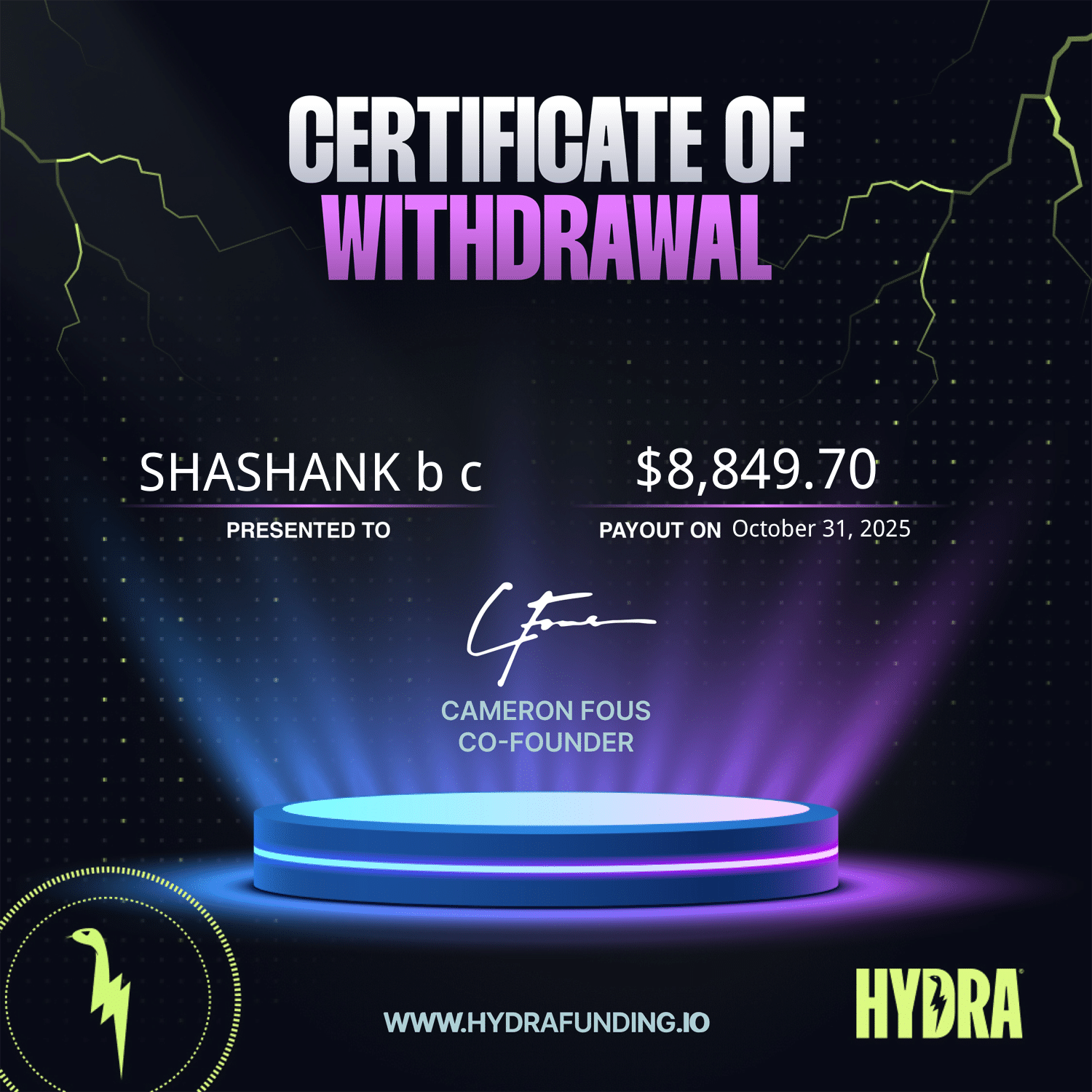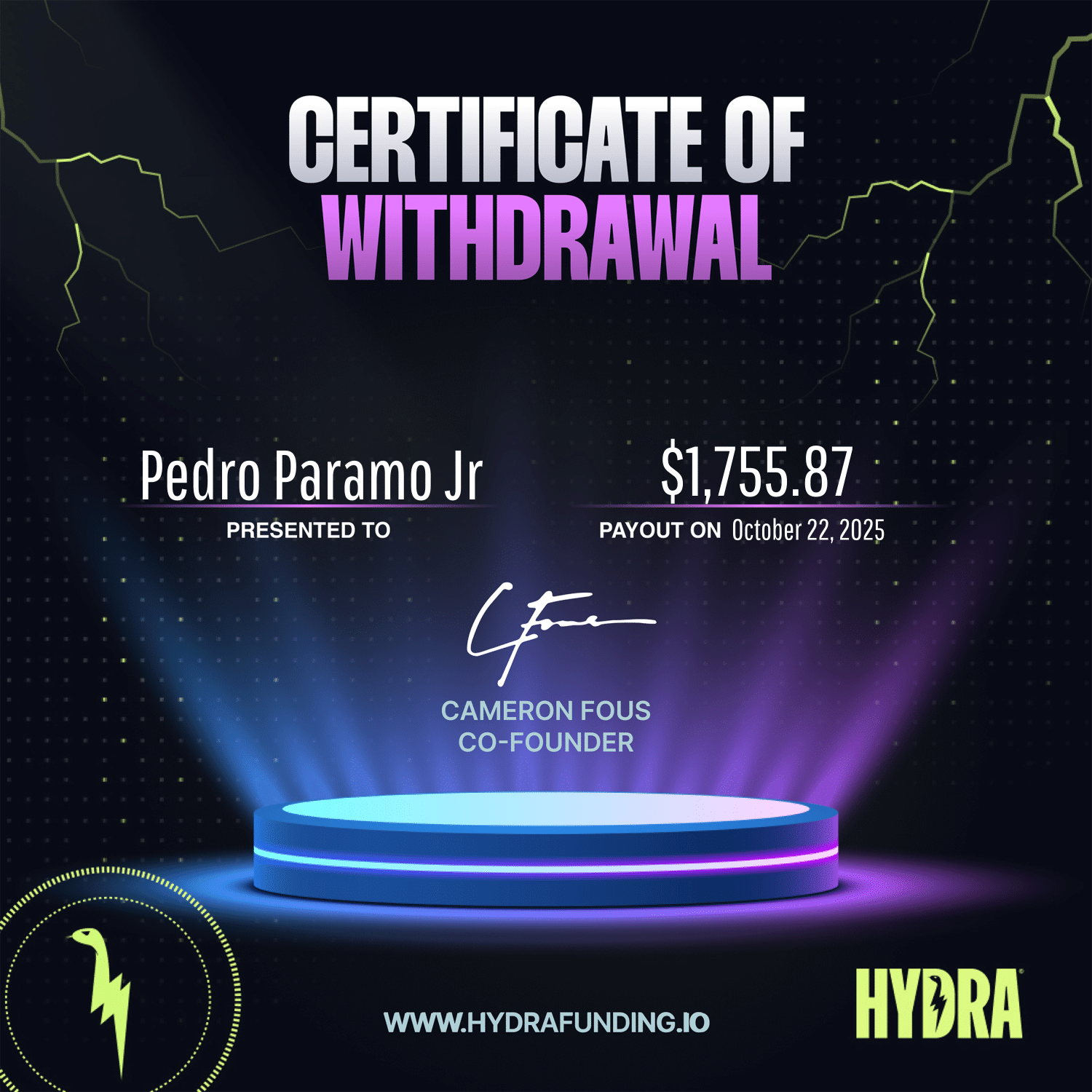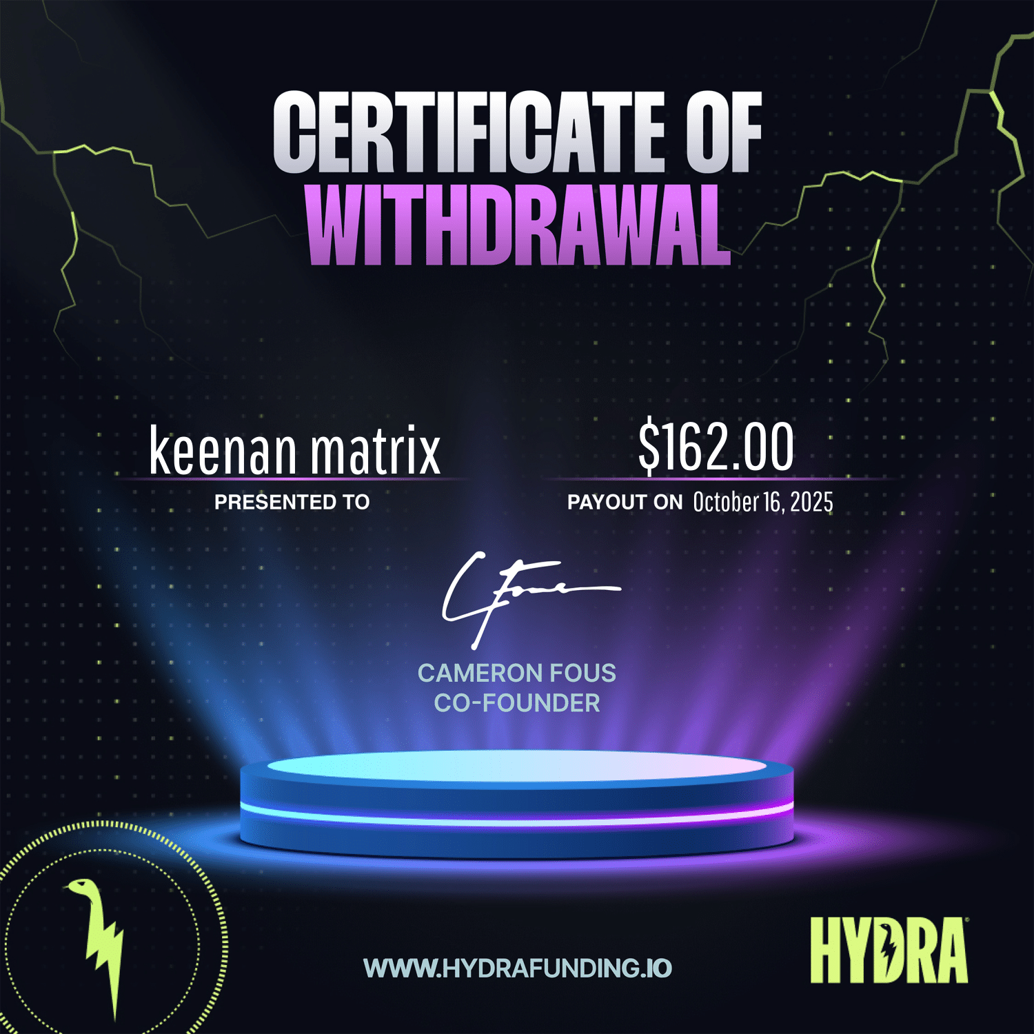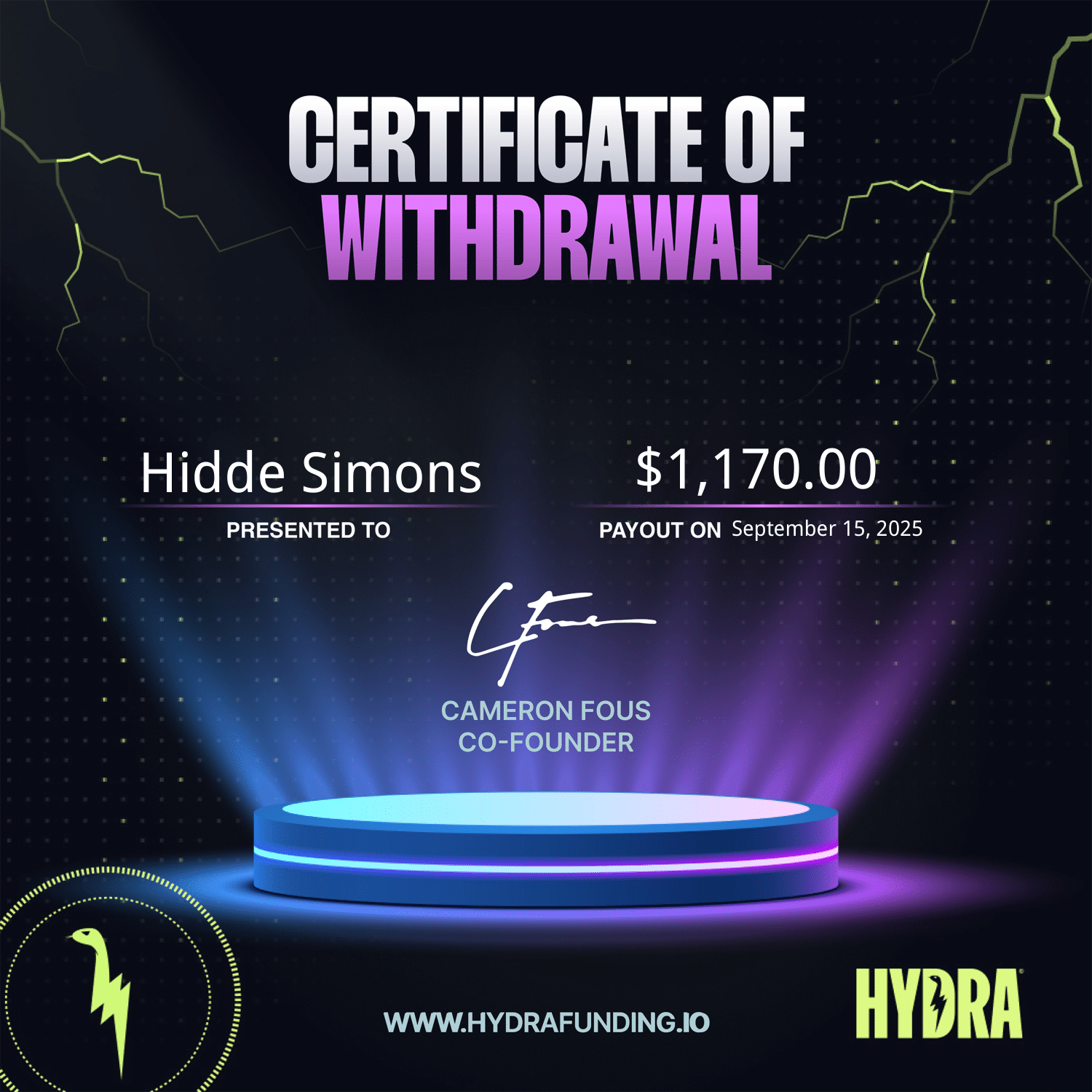 Top Hydra traders have historically withdrawn an average of ~5.4% per payout, based on disciplined risk management and consistent performance.