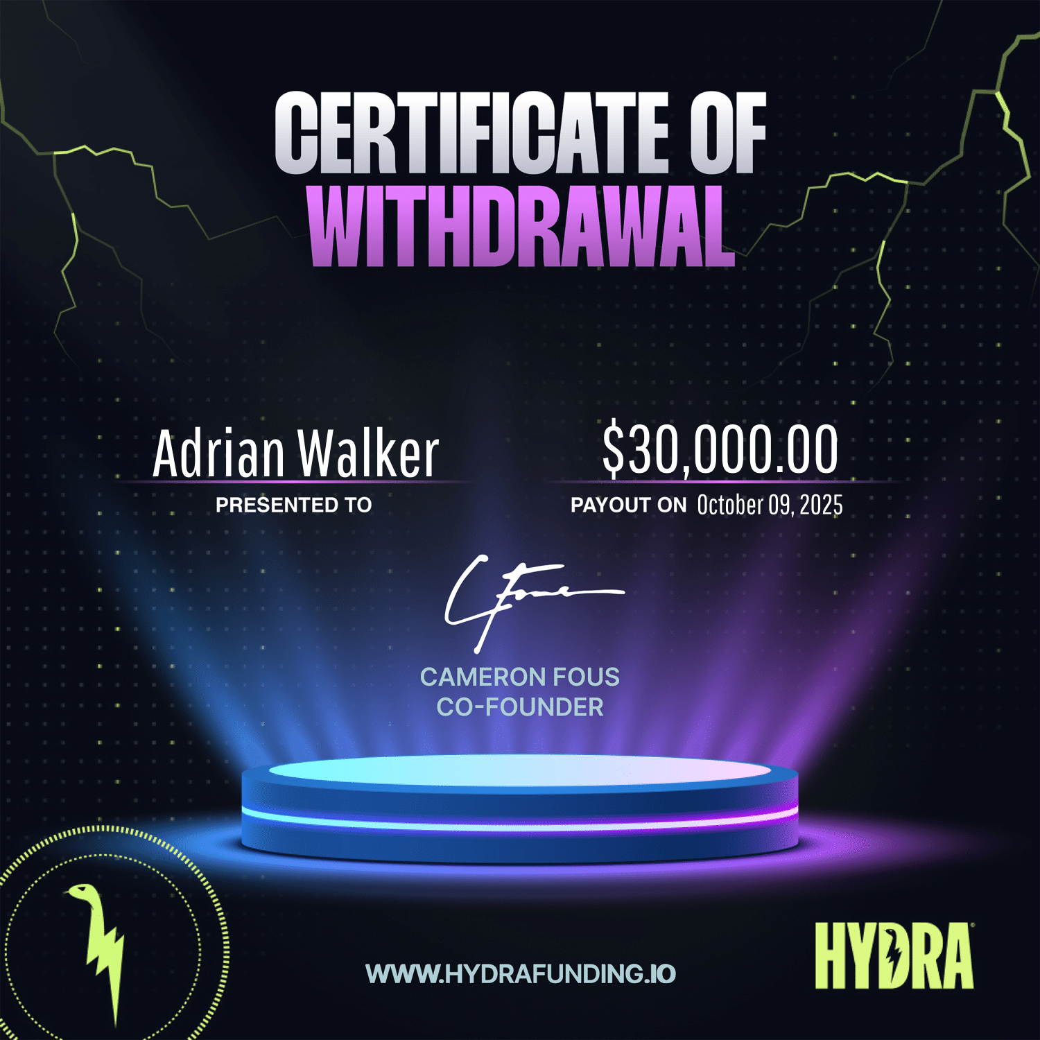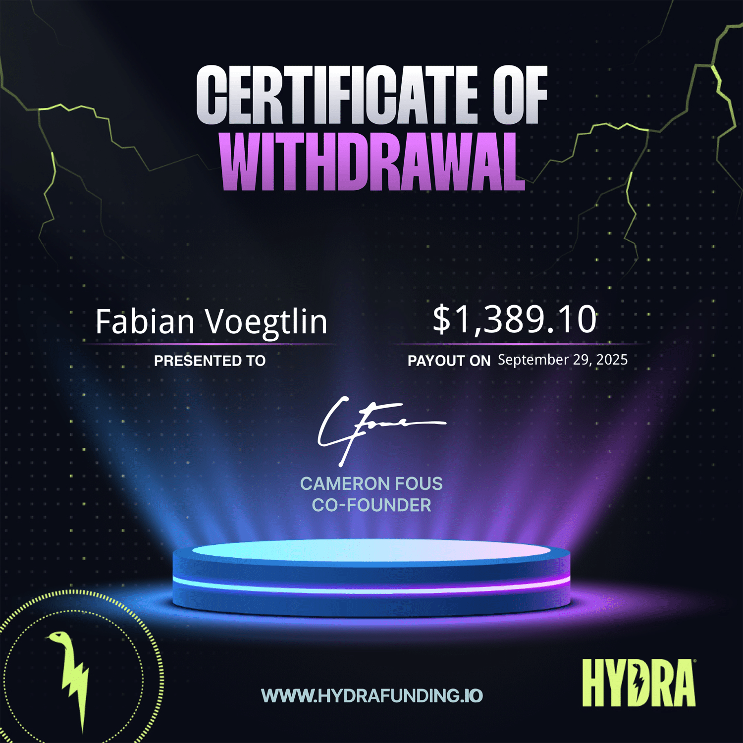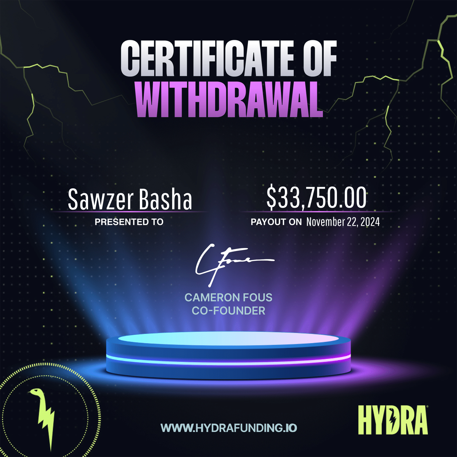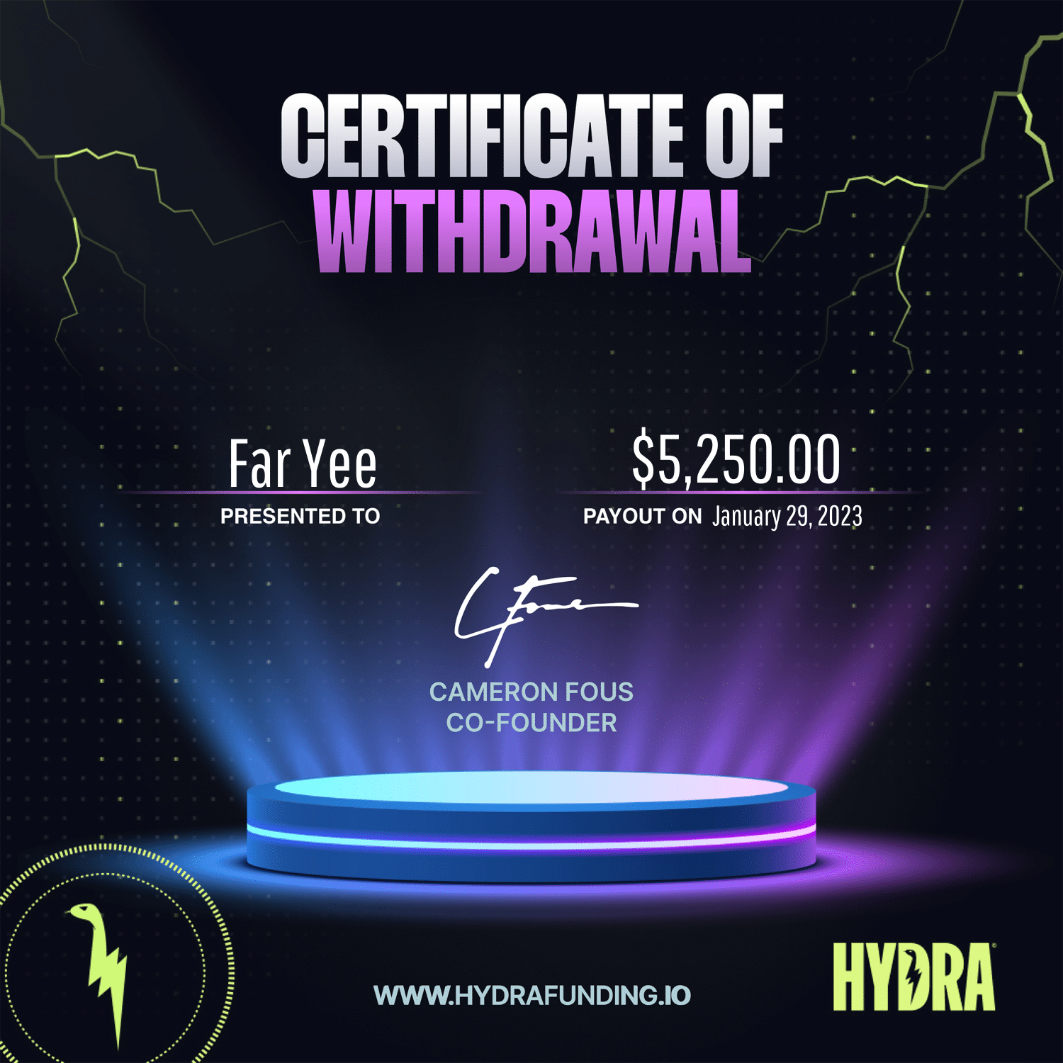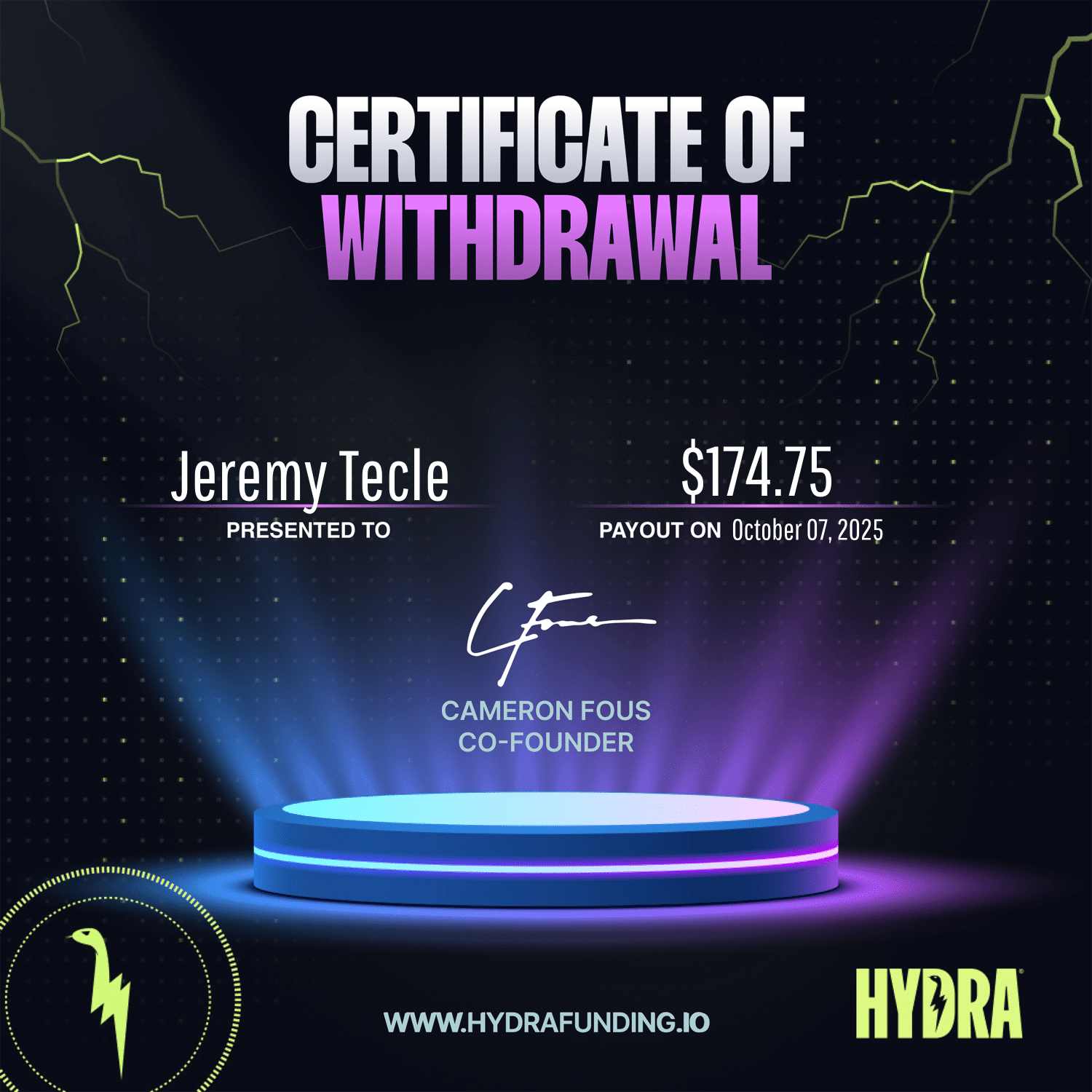 Top Hydra traders have historically withdrawn an average of ~5.4% per payout, based on disciplined risk management and consistent performance.