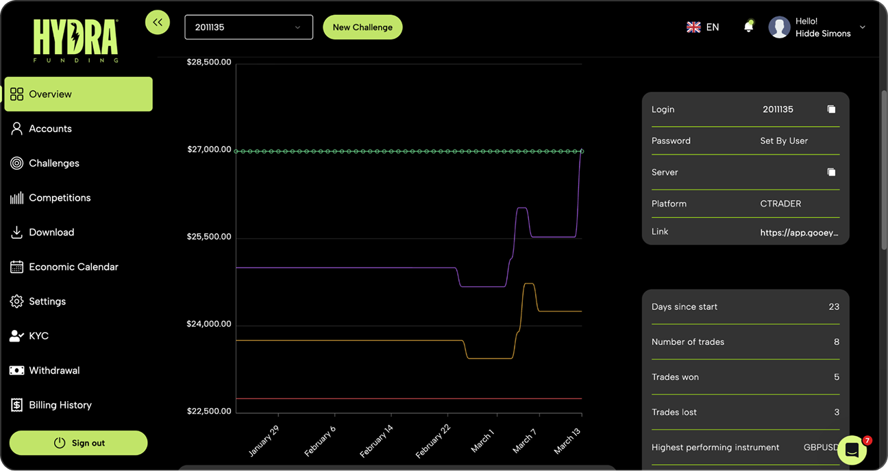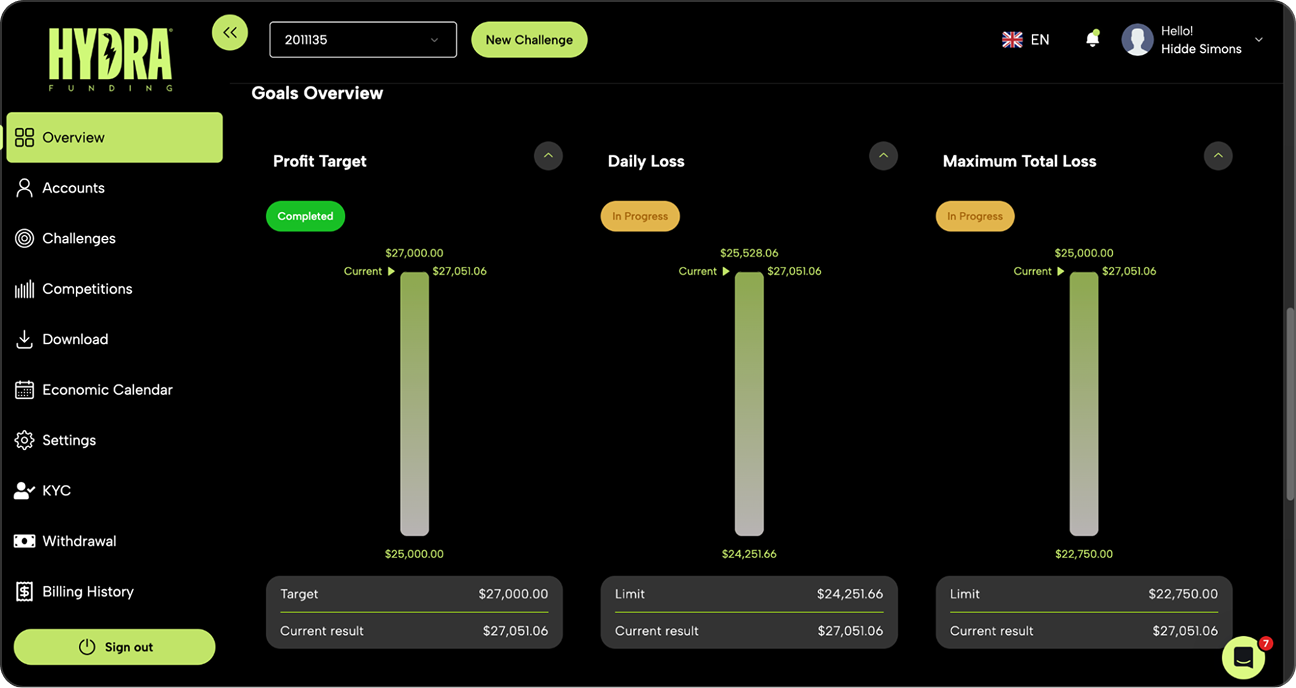 Upon purchase, you will receive access to the Hydra funding dashboard where you can monitor the progress of your account. The dashboard is updated in near real time as we calculate your account metrics. It is your responsibility to monitor your breach levels.